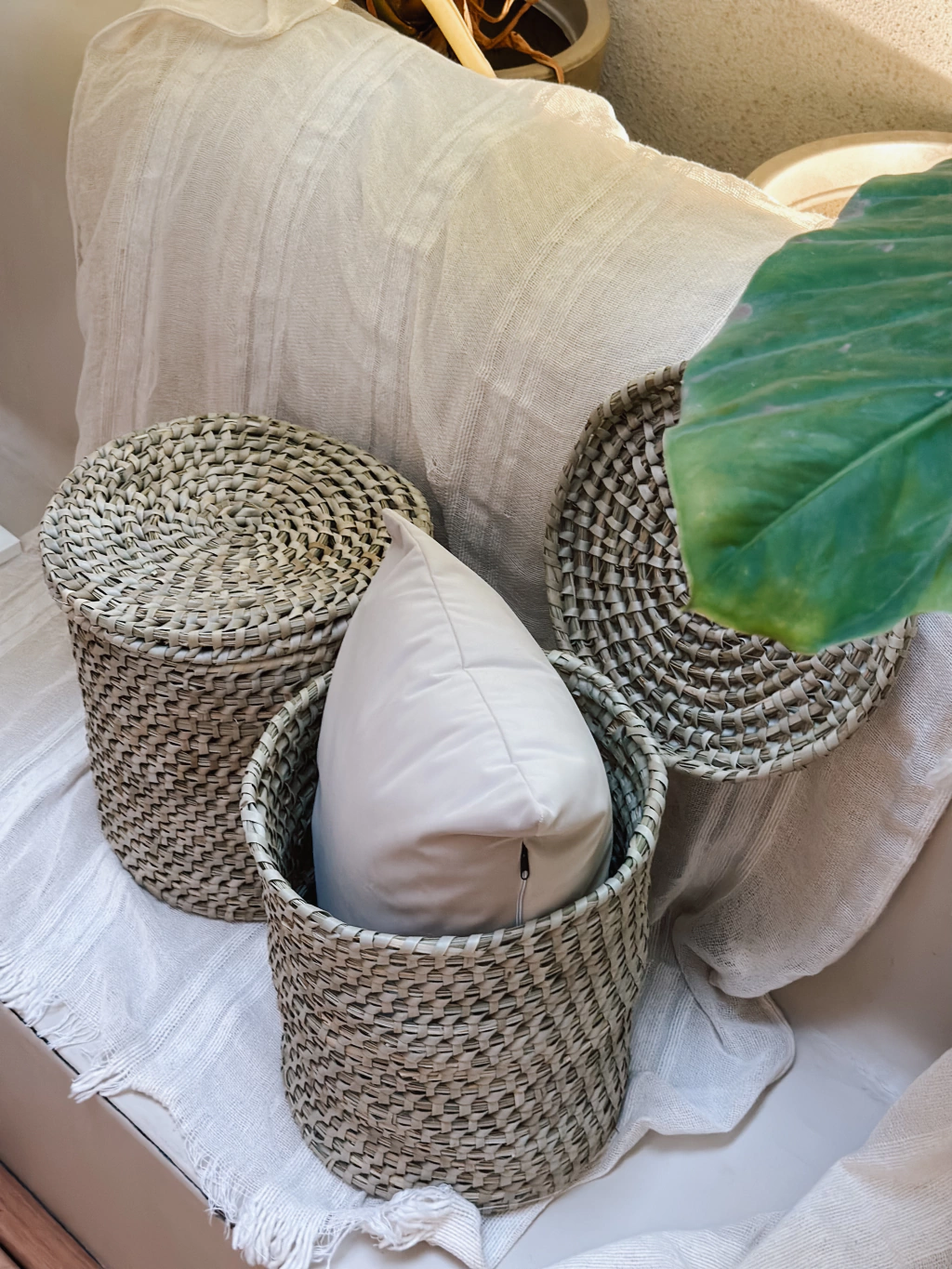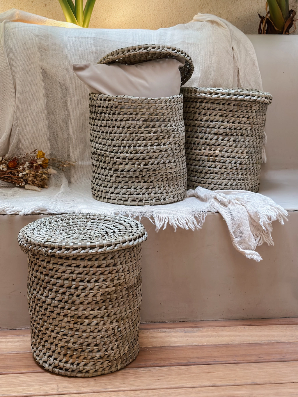 Canasto con tapa tejido artesanalmente en palma de Caranday