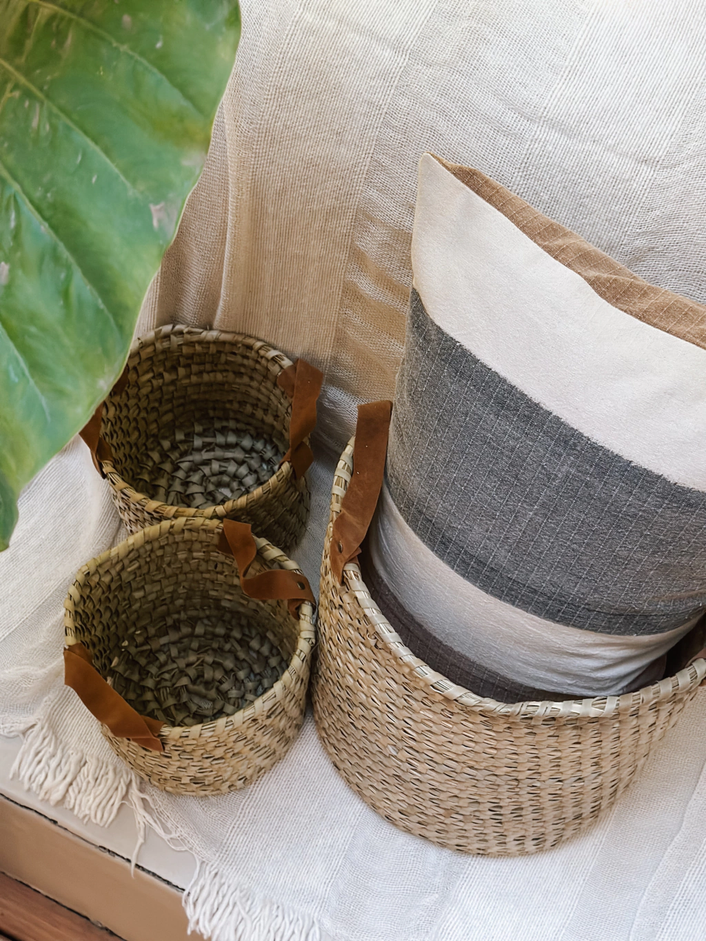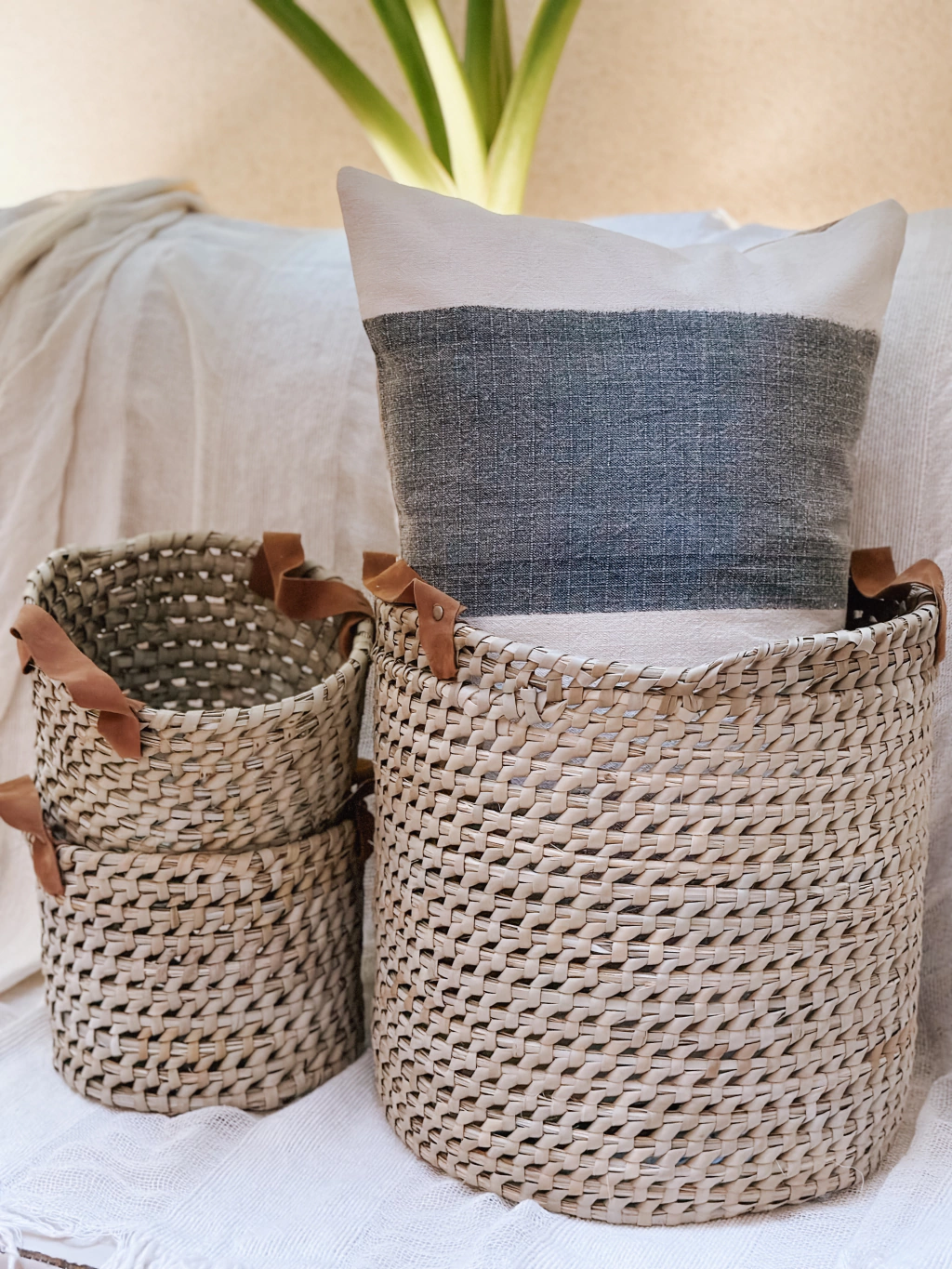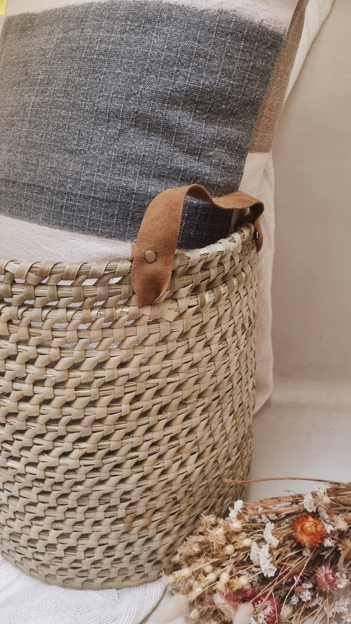Canasto tejido artesanalmente en palma de Caranday. Tiene asas laterales de gamuza para agarrar. Disponible en 2 medidas S 20 x 15 cm L 30 x 32 cm Al ser un producto natural puede presentar ligeras variaciones en el color de la palma. BeeTip: ideales para guardar juguetes, calzado u objetos que no quieras que queden a la vista. Los chiquitos son súper funcionales úsalos en el baño con productos de higiene personal, productos de cosmética o make up, en el lavadero con broches o en la cocina para guardar cositas!!