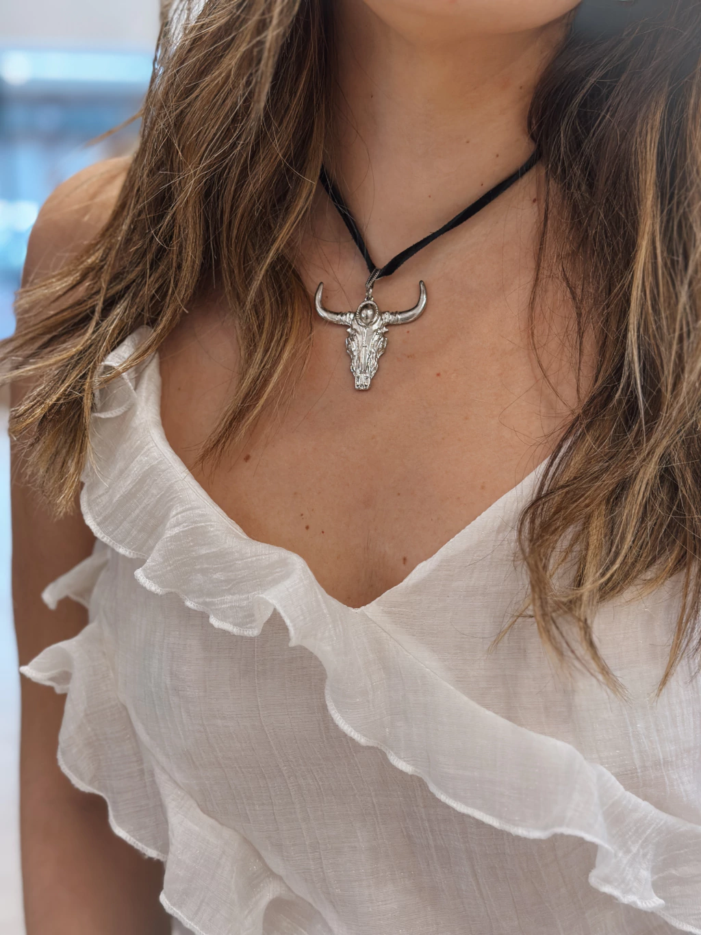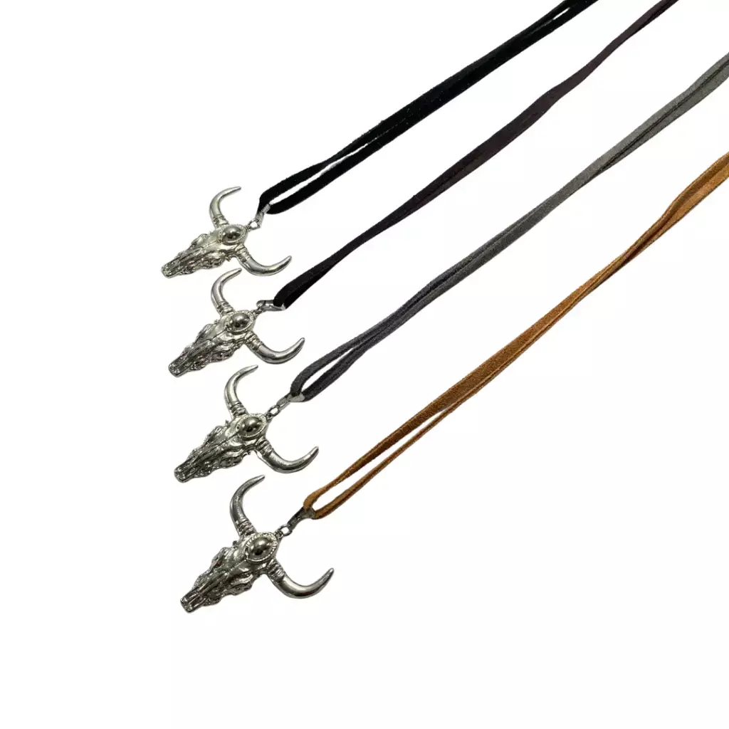 Collar de gamuza con dije en forma de toro. Disponible en 4 colores.