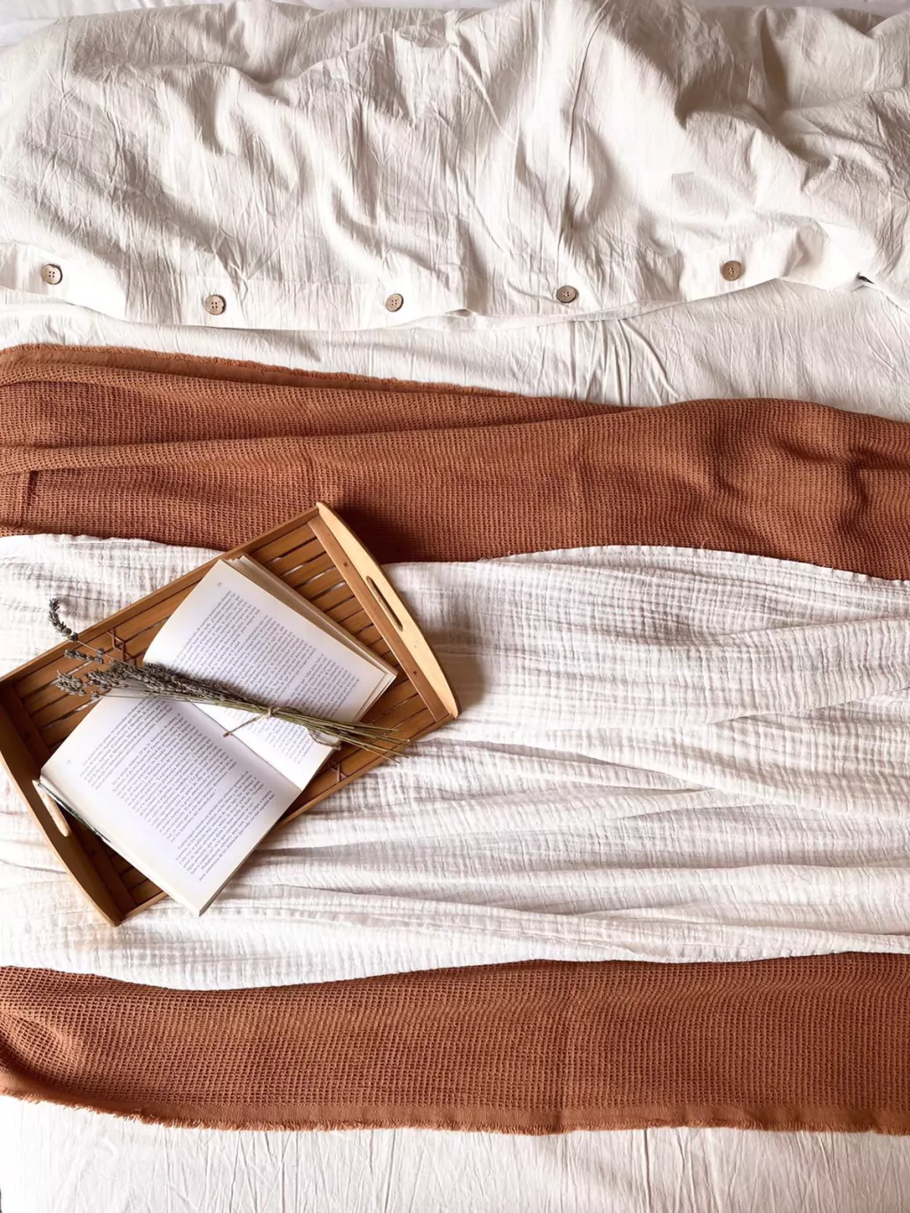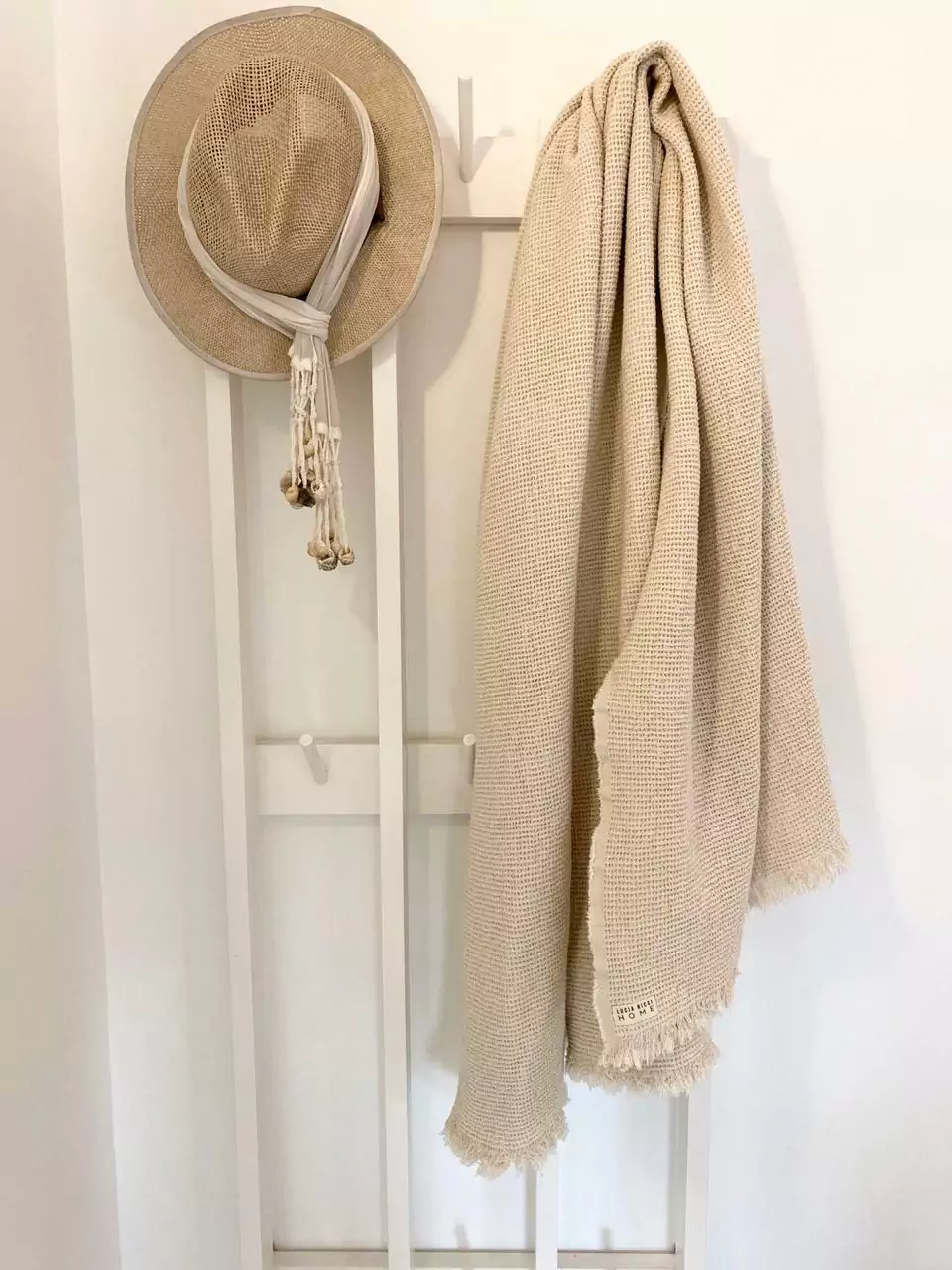 Tela: Tejido Waffle 100% algodónManta / Pie de Cama con terminación desflecada.