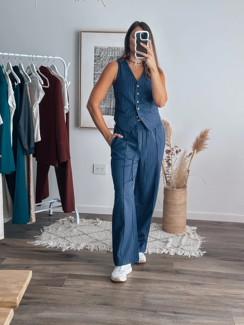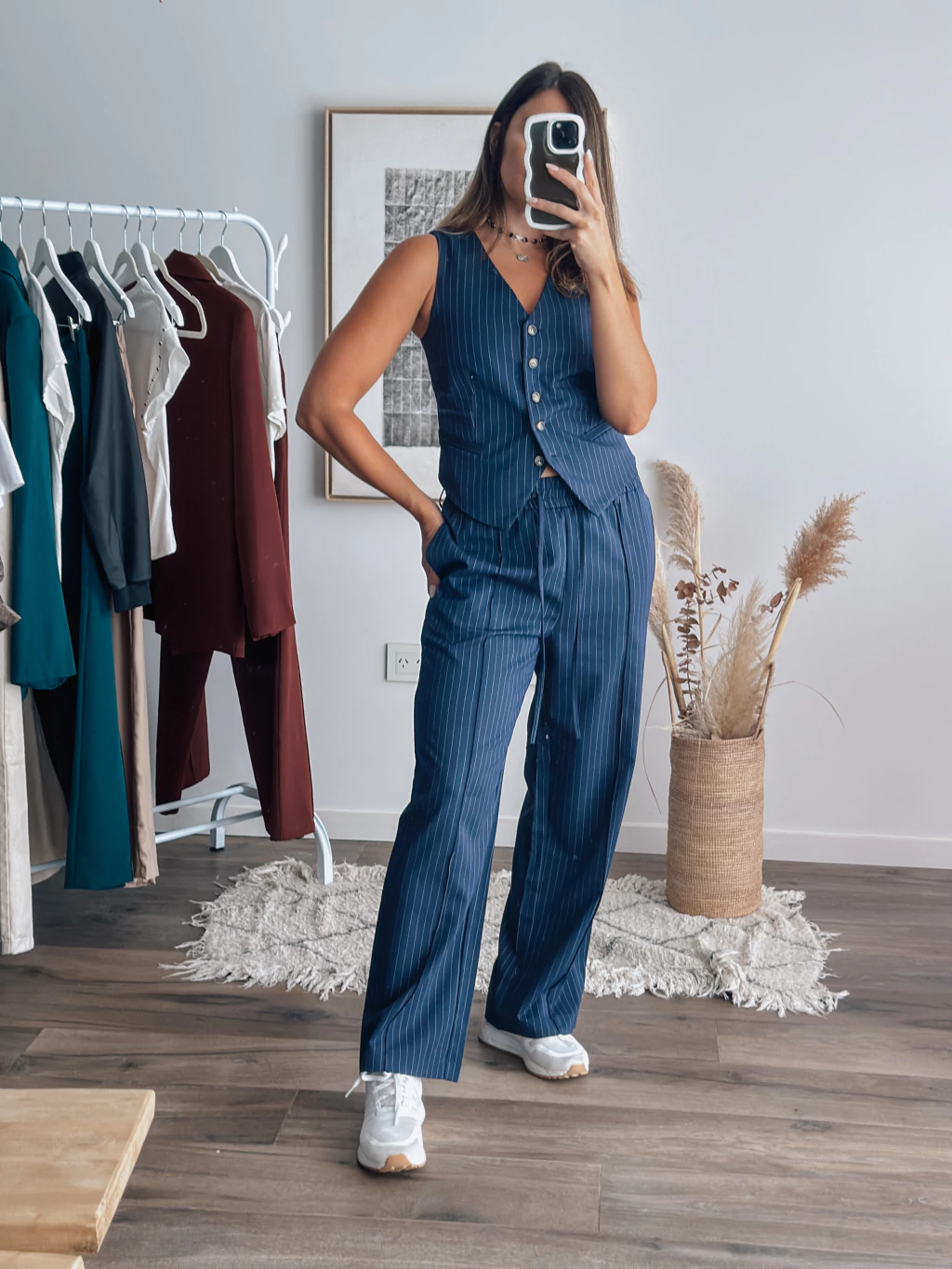 Descripción : Pantalón recto con pinzas delanteras y traseras. Tiene bolsillos delanteros. Elastico en la cintura . Trasera con doble pinza y bolsillos falsos.