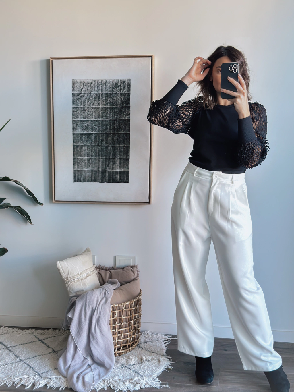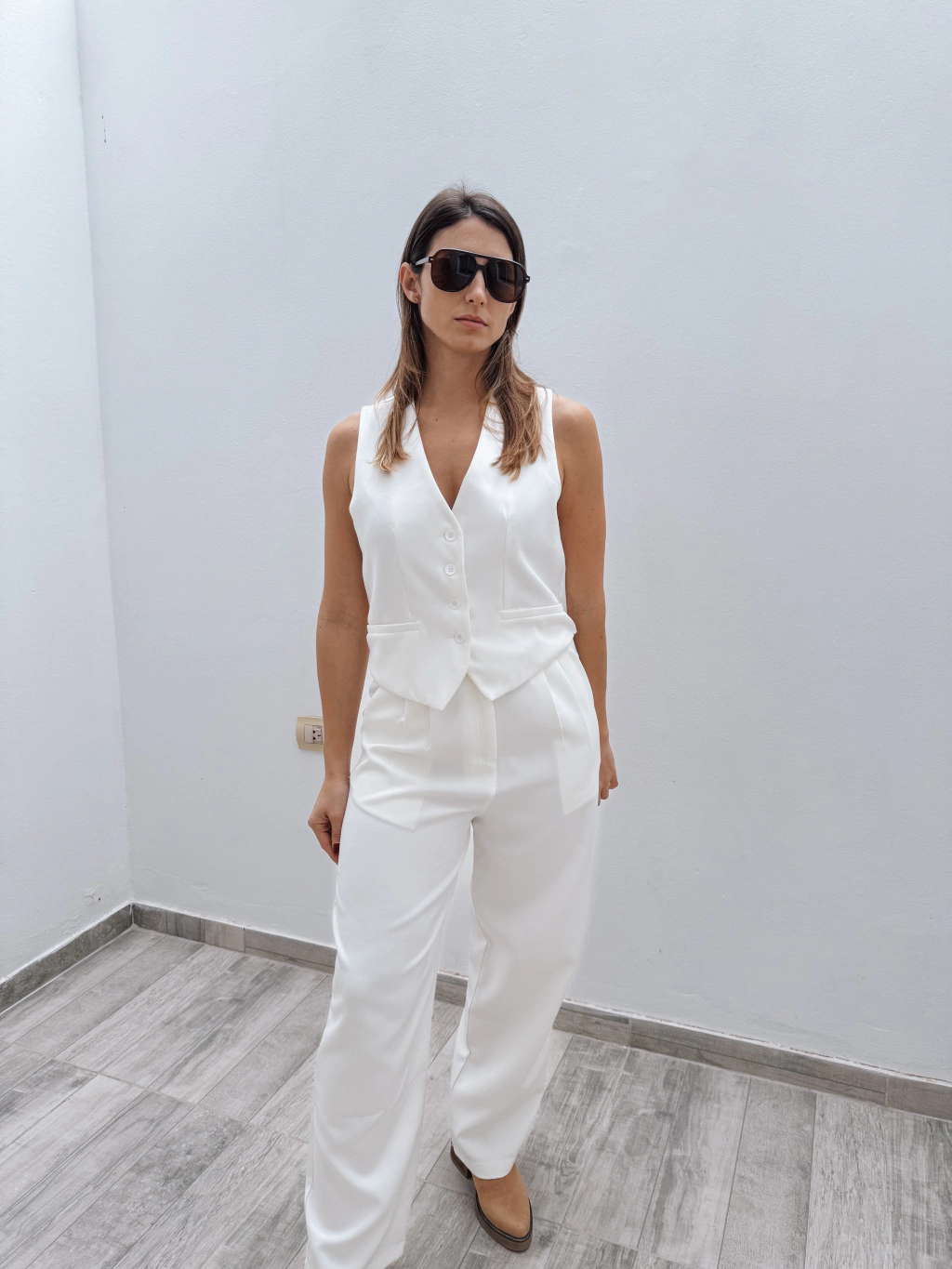Pantalón sastrero ancho con pinzas y bolsillos falso ojal en trasero. Tela y composición: Crep sastrero. 97% poliéster y 3% spandex.