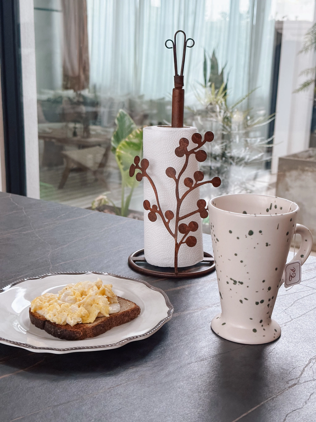 Portarrollos de papel de cocina de hierro. Disponible en dorado y óxido.