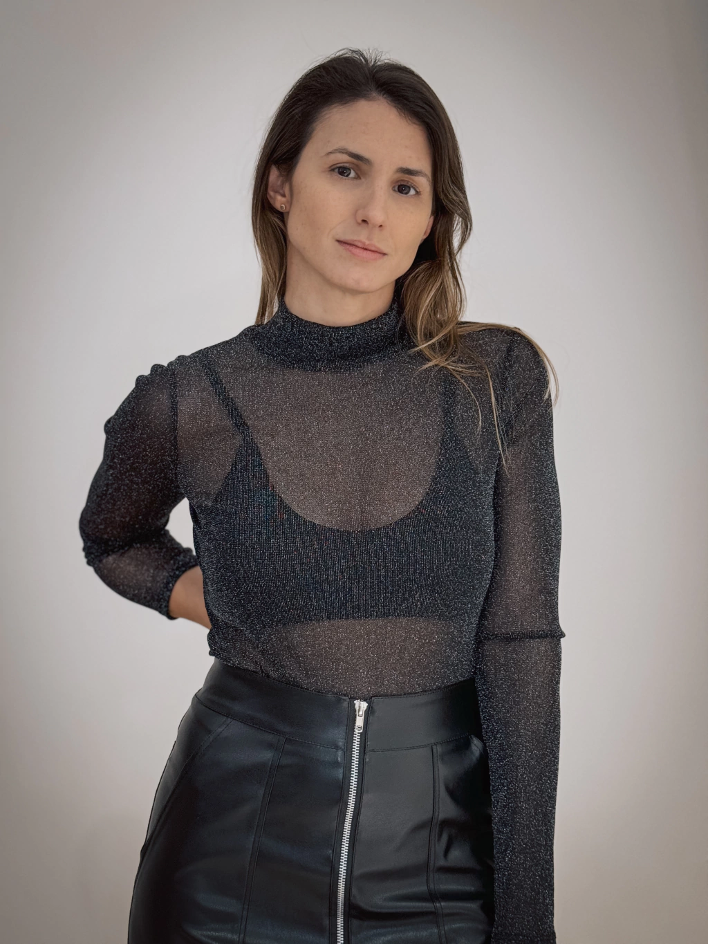Remera de lurex. Talle único. No incluye el top que tiene puesto Vir en las fotos.