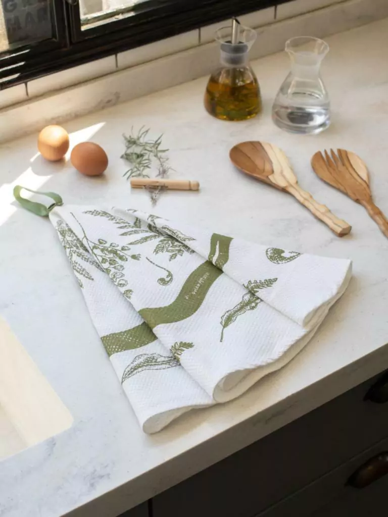 EPaño en formato redondo, con cinta para colgar desde el centro, con estampa serigráfica manual botánica en tinta verde seco. Ideal para secarse las manos por su volumen de tela.