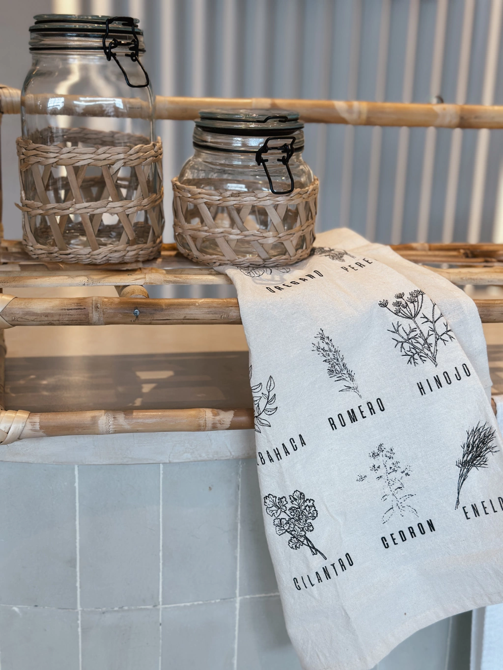 Dúo de paños 100 % algodón ( nido de abejas y lienzo), con detalle cocido y estampado en serigrafía manual, que estimula el uso consciente de los productos que tenemos en casa, con el fin de colaborar en la no contaminación de nuestro planeta.