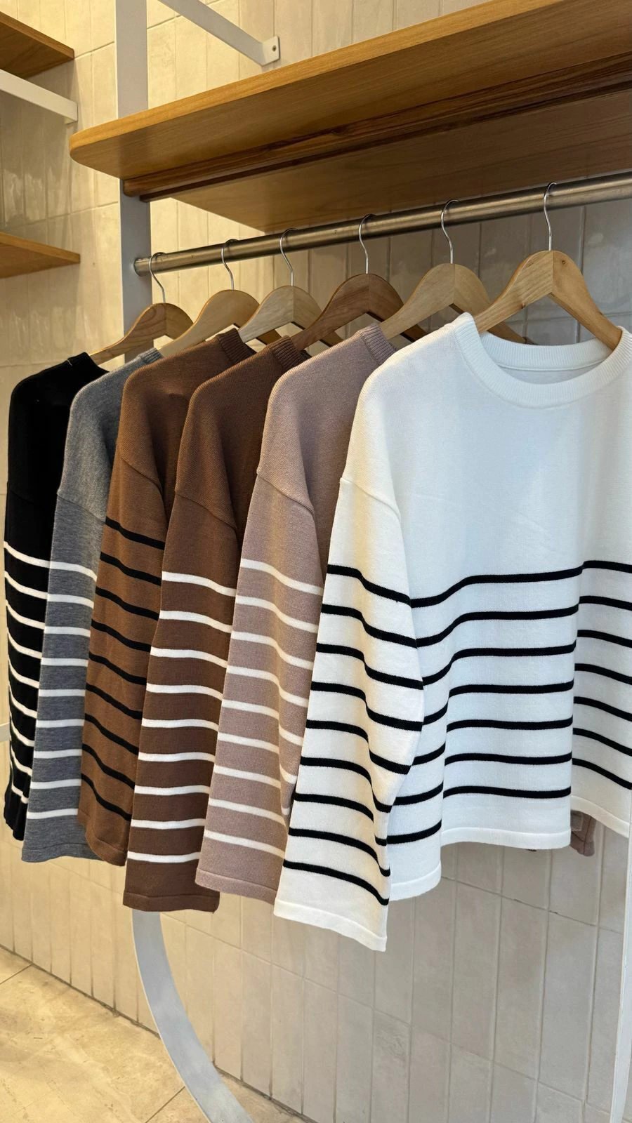 Sweater de hilo con rayas a contratono, holgado, de cuello redondo.