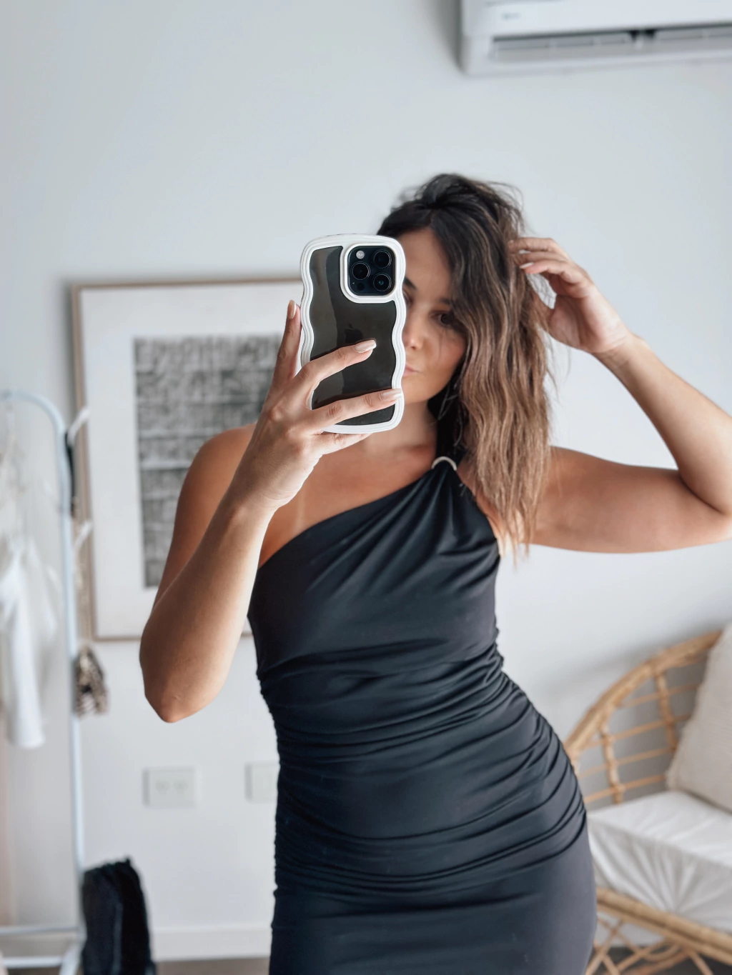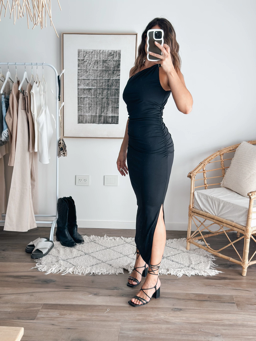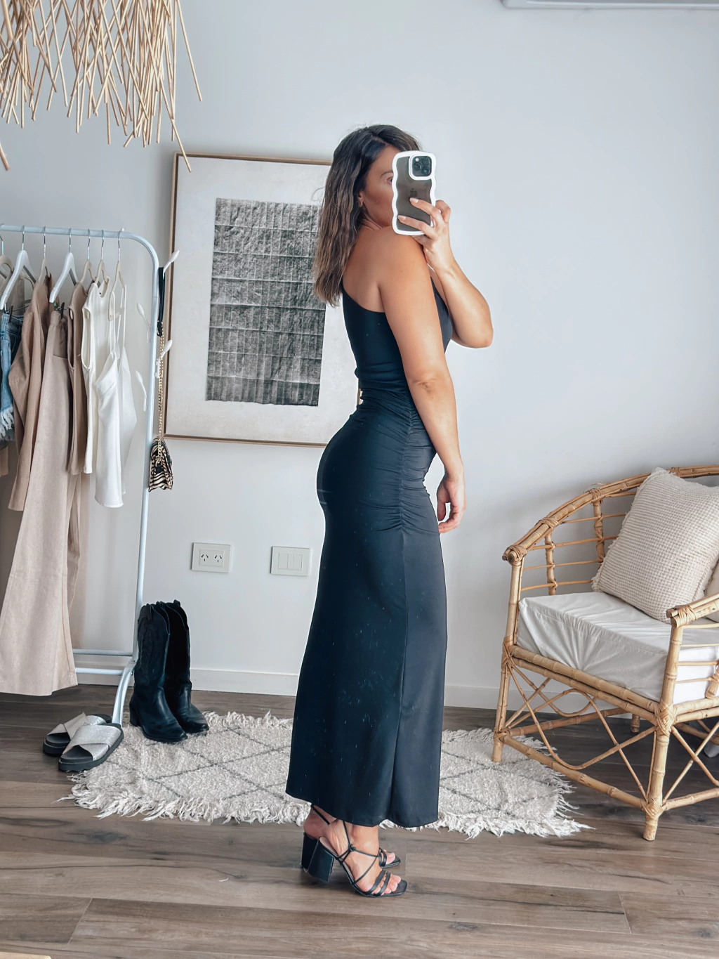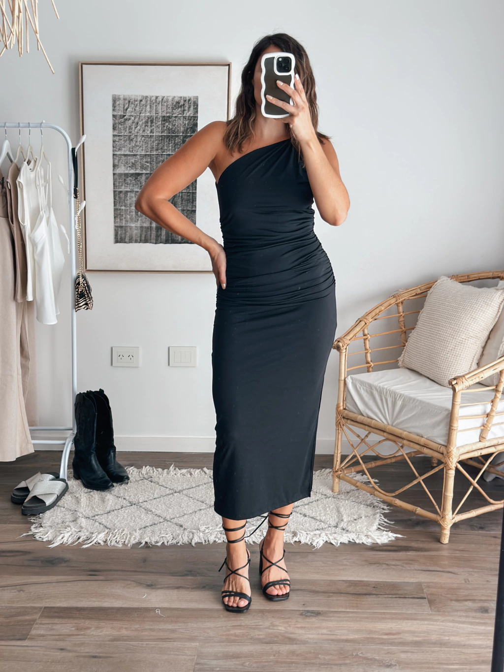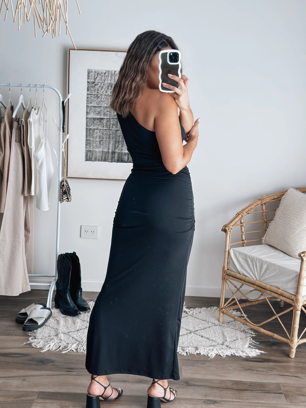 Vestido largo de un hombro con frunces en los costados. El hombro lleva frunces también con un detalle de argolla color plata. Talle MTELA: MICROFIBRA